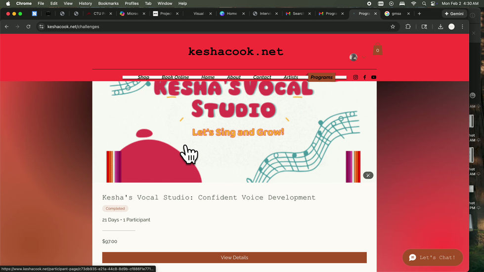 This section also includes a screen recording walkthrough of my most recent project with Kesha Cook LLC — Vocal Lesson App (launching soon!). I built the full course structure, designed the visuals, and integrated everything into her website. The recording shows the full user experience and the design decisions behind it.